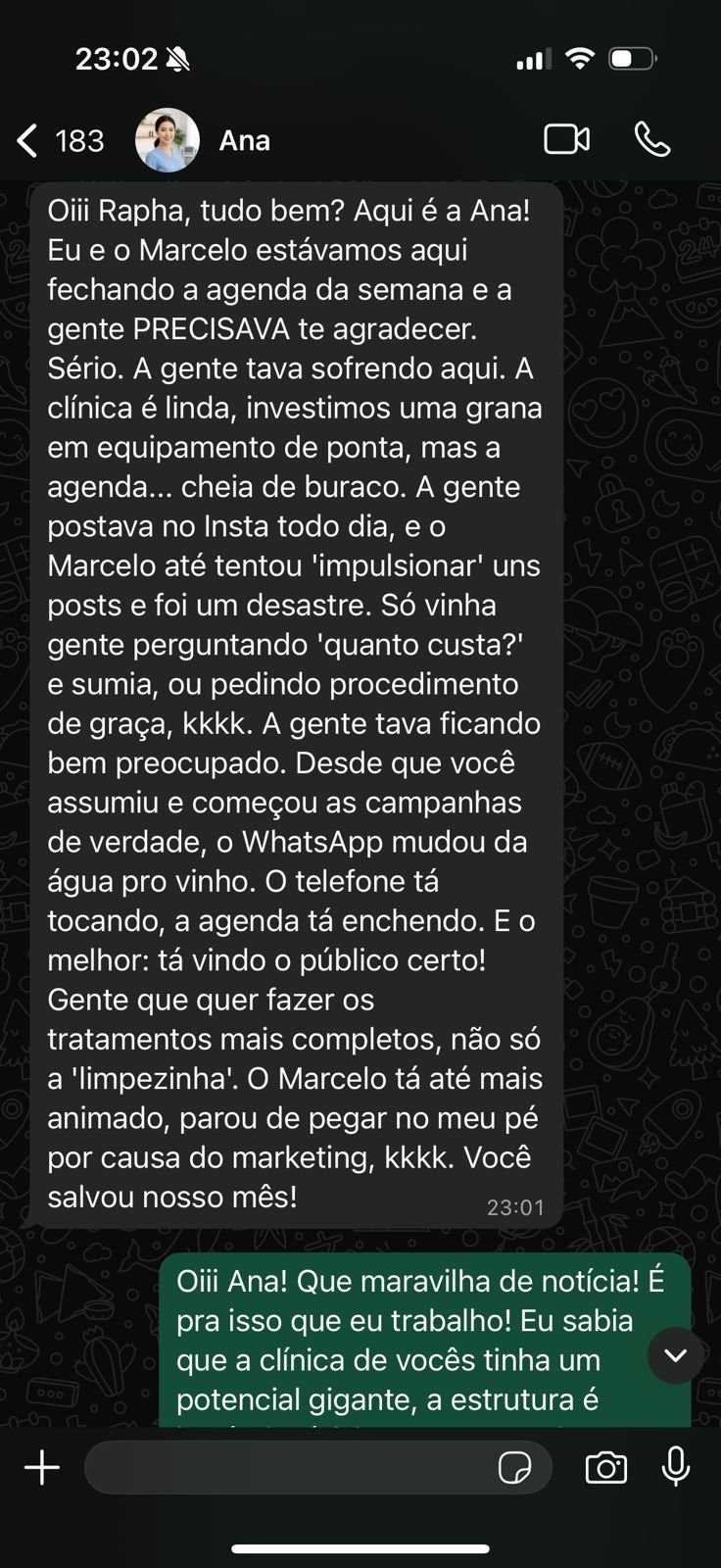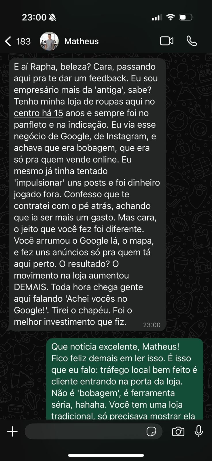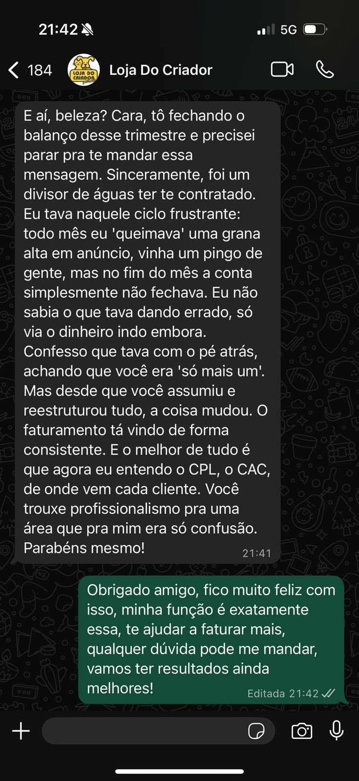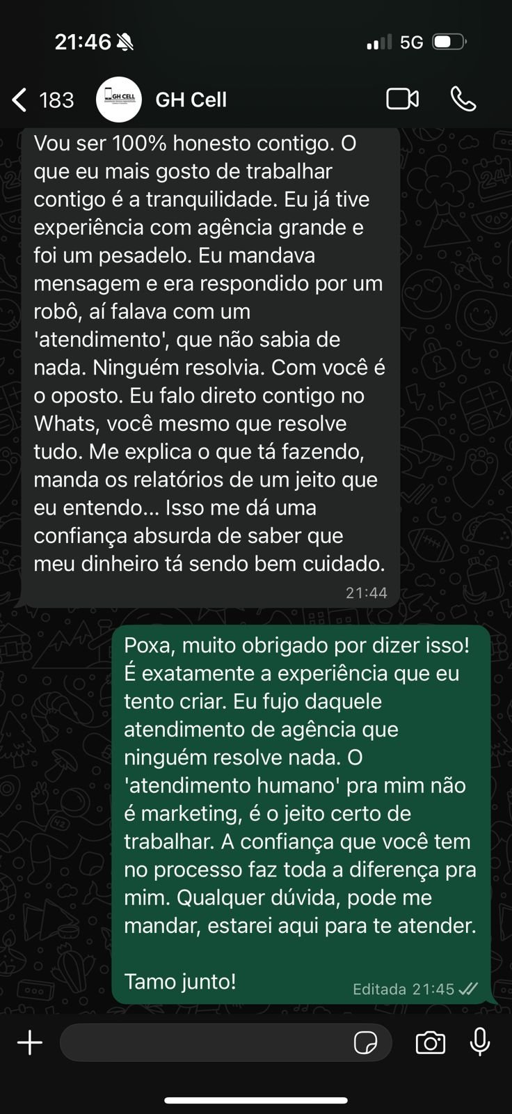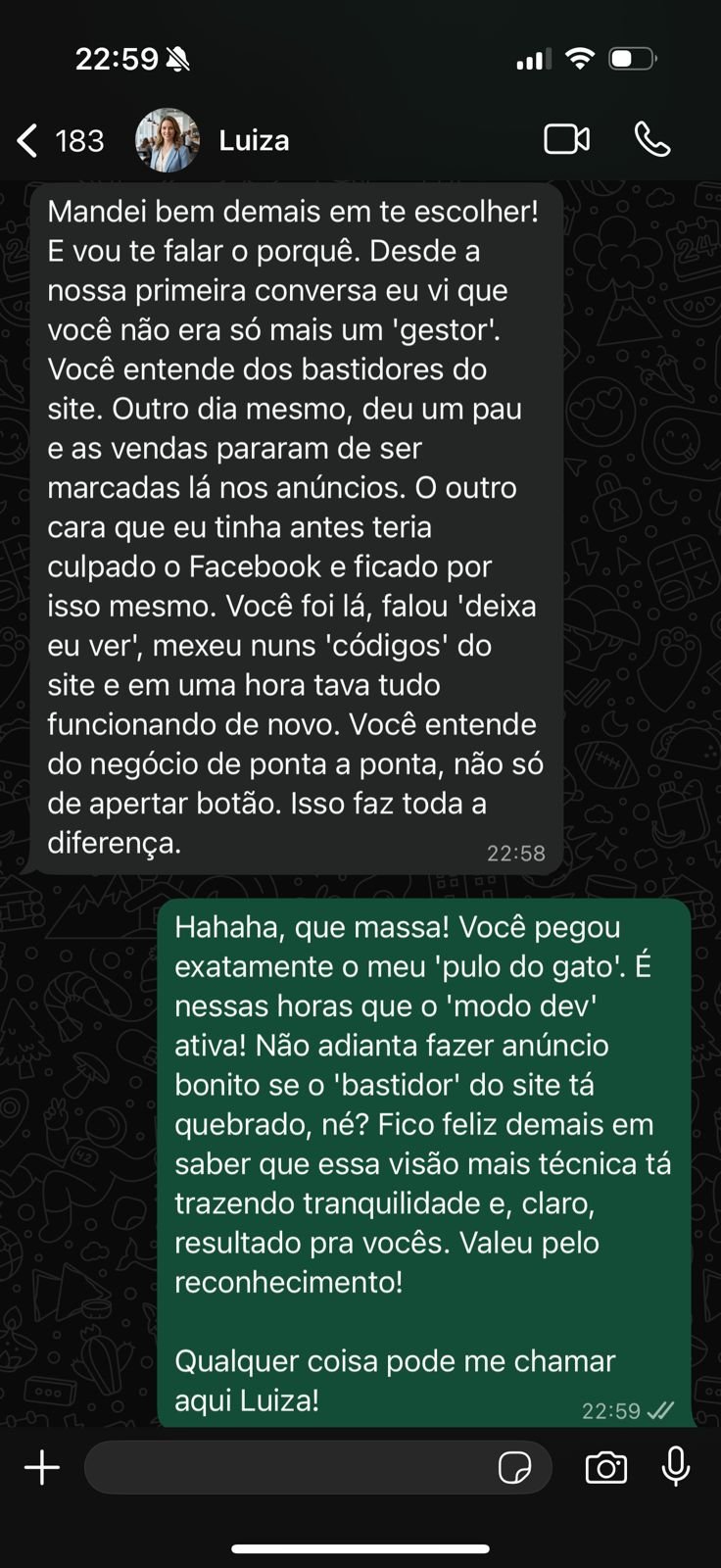 Meu maior diferencial é o atendimento humanizado e próximo: aqui você fala direto comigo, o especialista que cuida da sua conta. Junto a isso, minha estratégia foca em gerar conversões reais, não apenas tráfego. Trabalho com estratégias personalizadas, análises constantes e otimização detalhada. Meu compromisso é com o crescimento do seu faturamento, não apenas com o número de cliques.