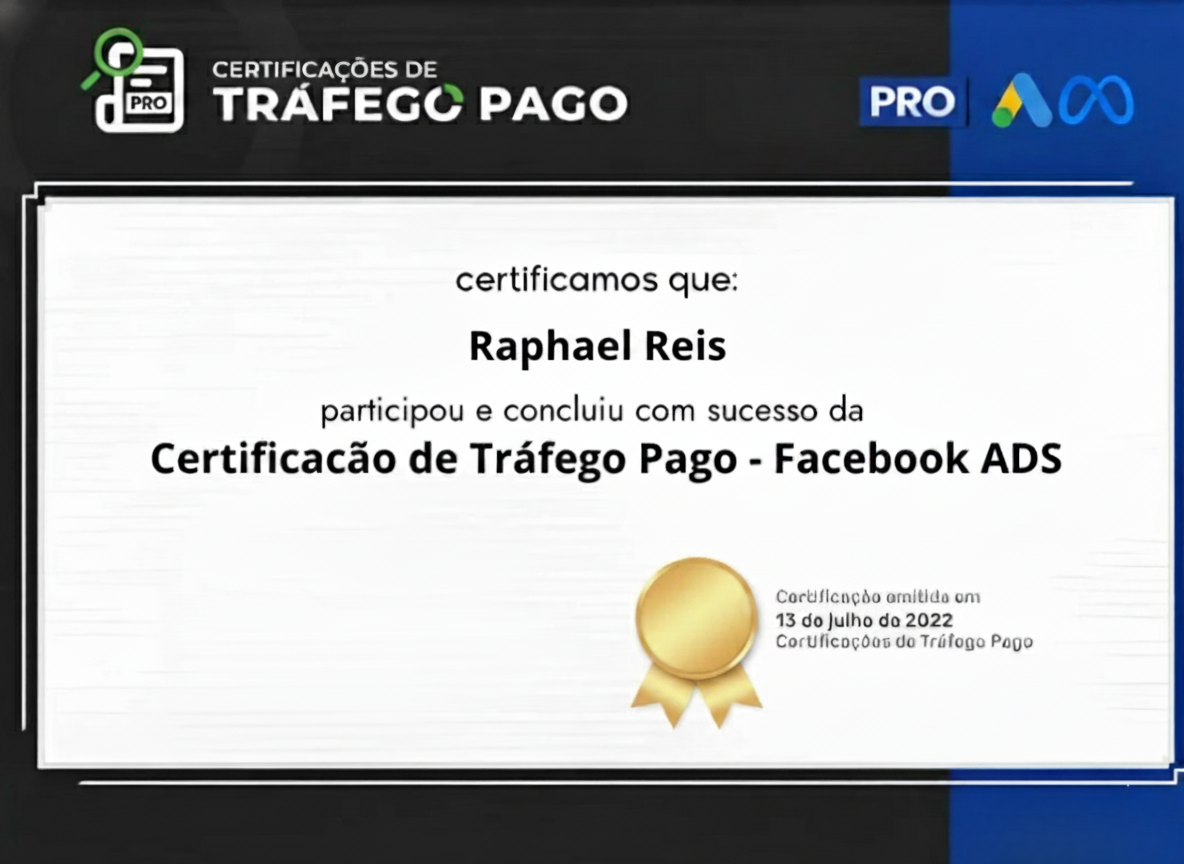 Meu principal objetivo é garantir que sua empresa alcance os melhores resultados. Para isso, estou sempre aprimorando minhas habilidades, aprendendo diretamente com os maiores especialistas em tráfego pago do Brasil, através da comunidade Descomplicando Ads. Além disso, faço parte do seleto grupo de 2% dos profissionais que foram certificados e aprovados pela própria Descomplicando Ads em Google Ads e Facebook Ads.